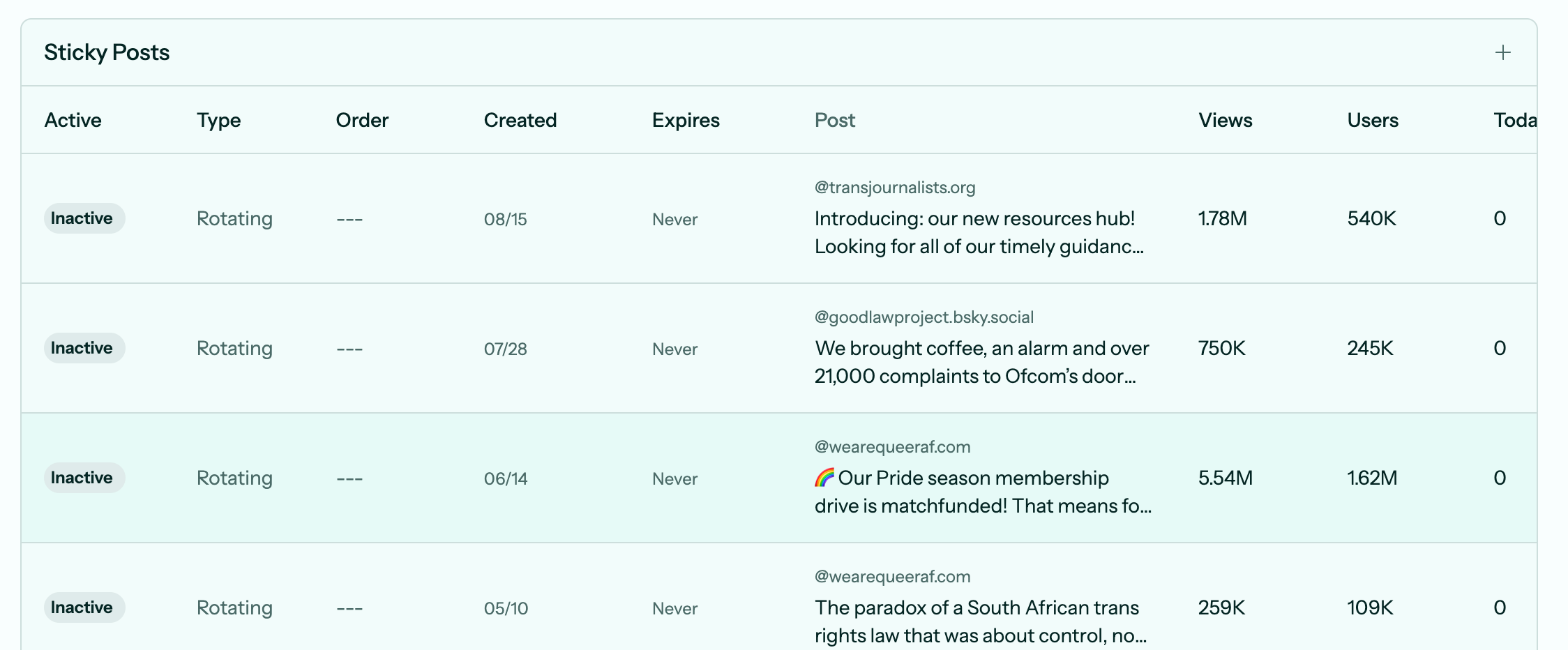 Right now, all the sticky posts in the screenshot are inactive, but you can see they're from various advocacy organizations talking about things like resource hubs, legal complaints to Ofcom, and Pride membership drives. The "Today" column shows zero views for all of them since they're turned off.