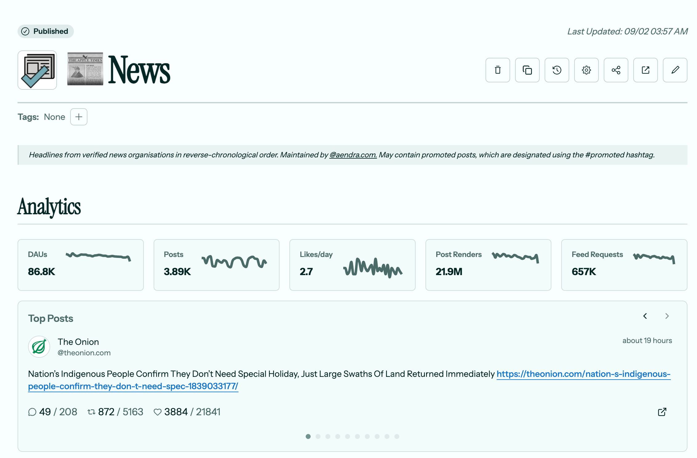 In the screenshot example, you can see The Onion's satirical post about Indigenous People's Day absolutely crushed it with 3.88K likes, 49 replies, and 872 reposts from feed readers. That's a pretty clear signal that satirical news content connects with this particular audience.